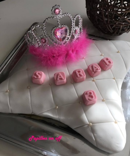 Après le gâteau poupée Barbie, voici le gâteau coussin de Princesse en pâte à sucre (au thermomix ou sans) de la petite Sarah. La déco était encore une fois sobre mais efficace ; assez pour faire briller les yeux d’une petite fille de 3 ans.